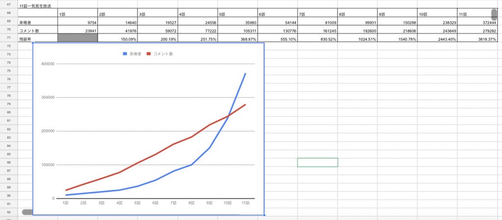 前日に行われた1~11話一挙(約267分)だと約37万人なのが、12話単独(約24分)が50万人弱まで増えたのが、未だに信じられない