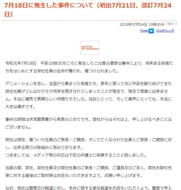 京都アニメーション、あらためて取材自粛をお願い 実名報道の自粛も書面で要請 nlab.itmedia.co.jp/nl/articles/19… @itm_nlabから