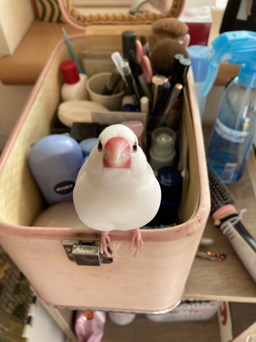今日も実家のインコがカップの持ち手に挟まってるし、デコ毛が逆立ってて世紀末ヒャッハー雑魚感がすごい。