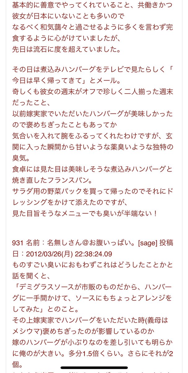 ここ2日ほどメシマズ嫁の話題が尽きないけど、私が1番強烈に覚えてるメシマズ嫁のエピソードはこれ。