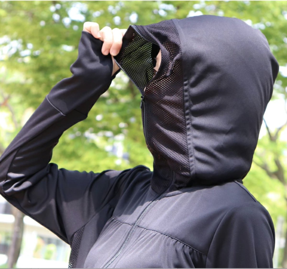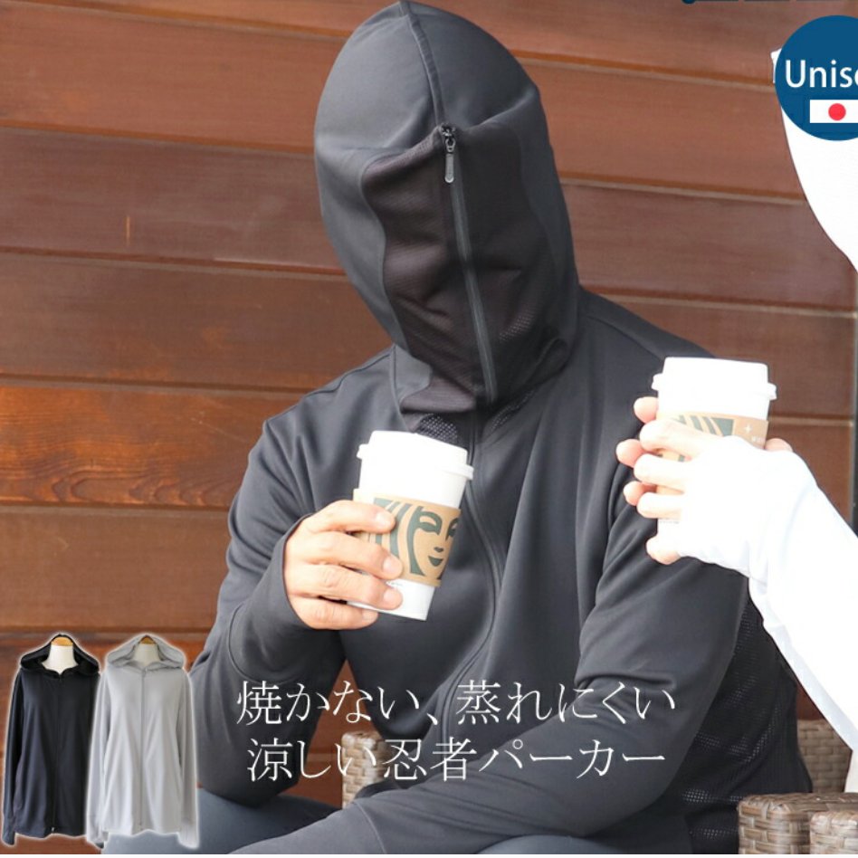 顔まで閉まるUVパーカー買うか悩む。その名もパーフェクトパーカーw黒の全部閉めたときの怪しさがすごいけどさ、日焼け止めより絶対確実に焼けないしこれなら野球も見に行けるよね。さらに完全遮光の帽子で完全紫外線対策。さて、買うか・・・?ちなみにスタバは飲めないと思うんだよね🥺